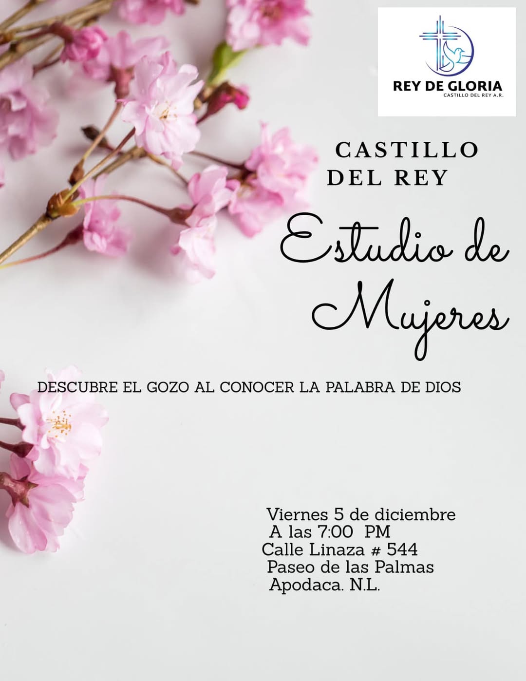 Estudio de Mujeres Estudio de Mujeres Descubre el Gozo de Conocer la Palabra de Dios Cuando: Cada primer Viernes de Mes. Donde: Calle Linaza #544Paseo de las PalmasApodaca, N. L. Costo: Evento Gratuito.Hora: 7:00 PM Invita a alguien más.Te esperamos!!